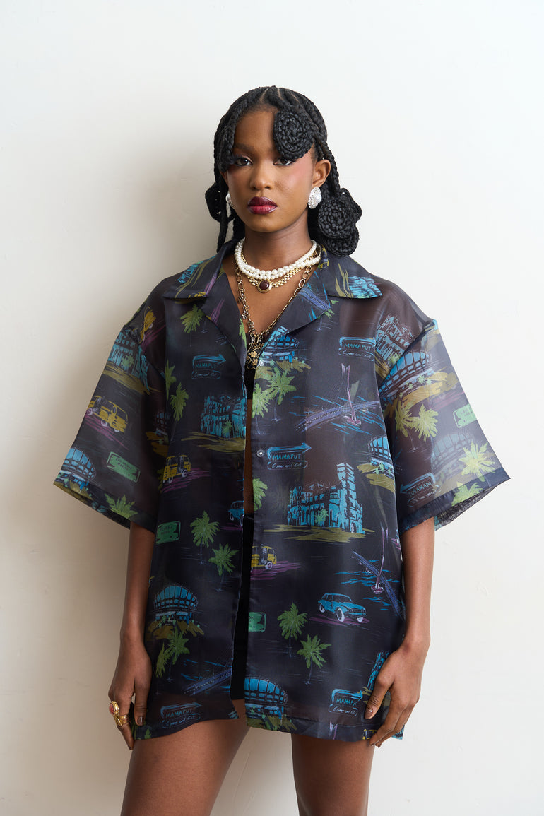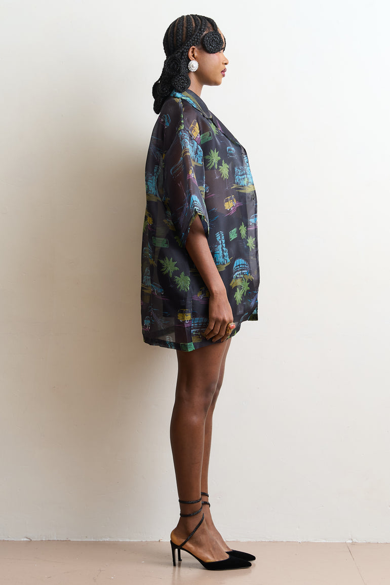 Our sheer organzas are the perfect styling pieces all year round. The oversized fit makes them ideal as a breezy cover-up in warmer climates or as a layering piece during the colder months. This style features the iconic "Eko" print".
