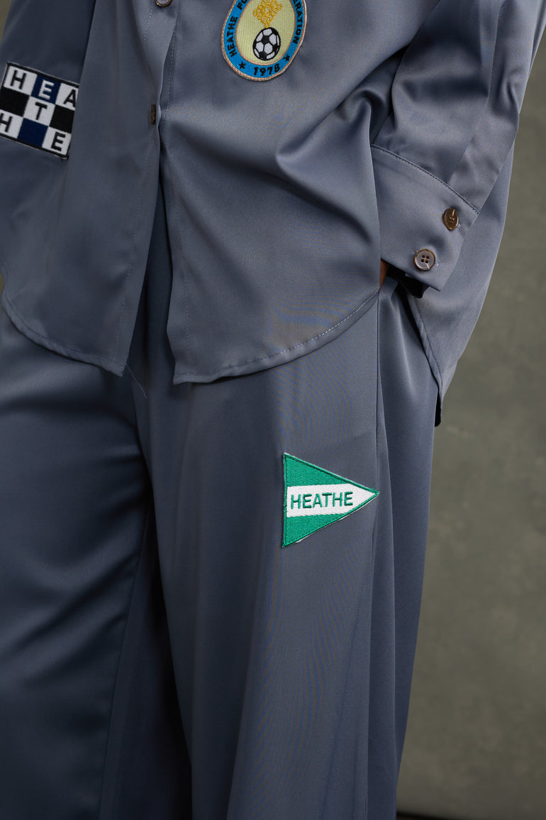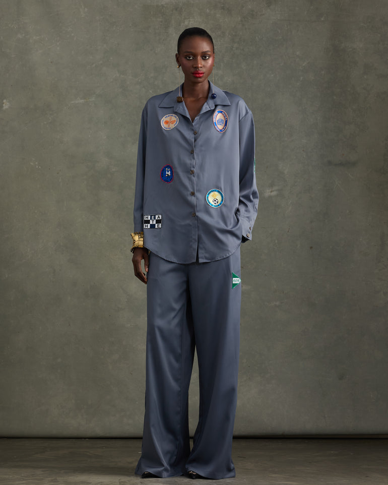 Pyjama set the Heathe way - not just for the house. Elevate your everyday with an iconic look. A loose-fit shirt embellished with vintage badges that take you down memory lane, back to simpler times - paired with matching loose-fit trousers.
