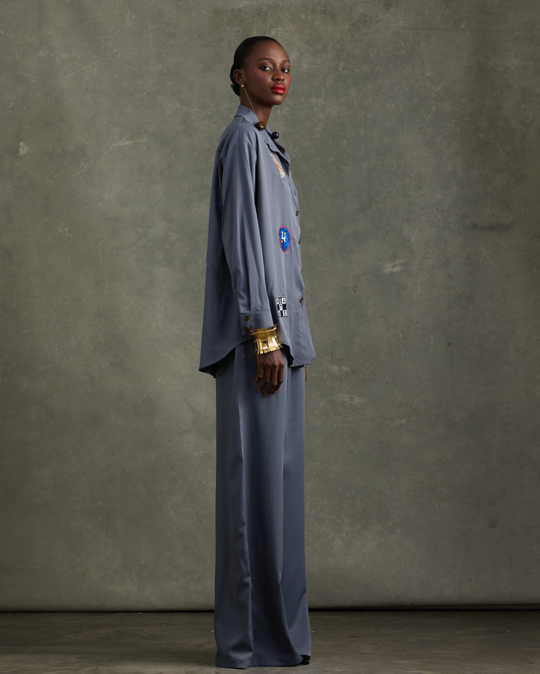- Vintage badge embellishment on shirt and trousers