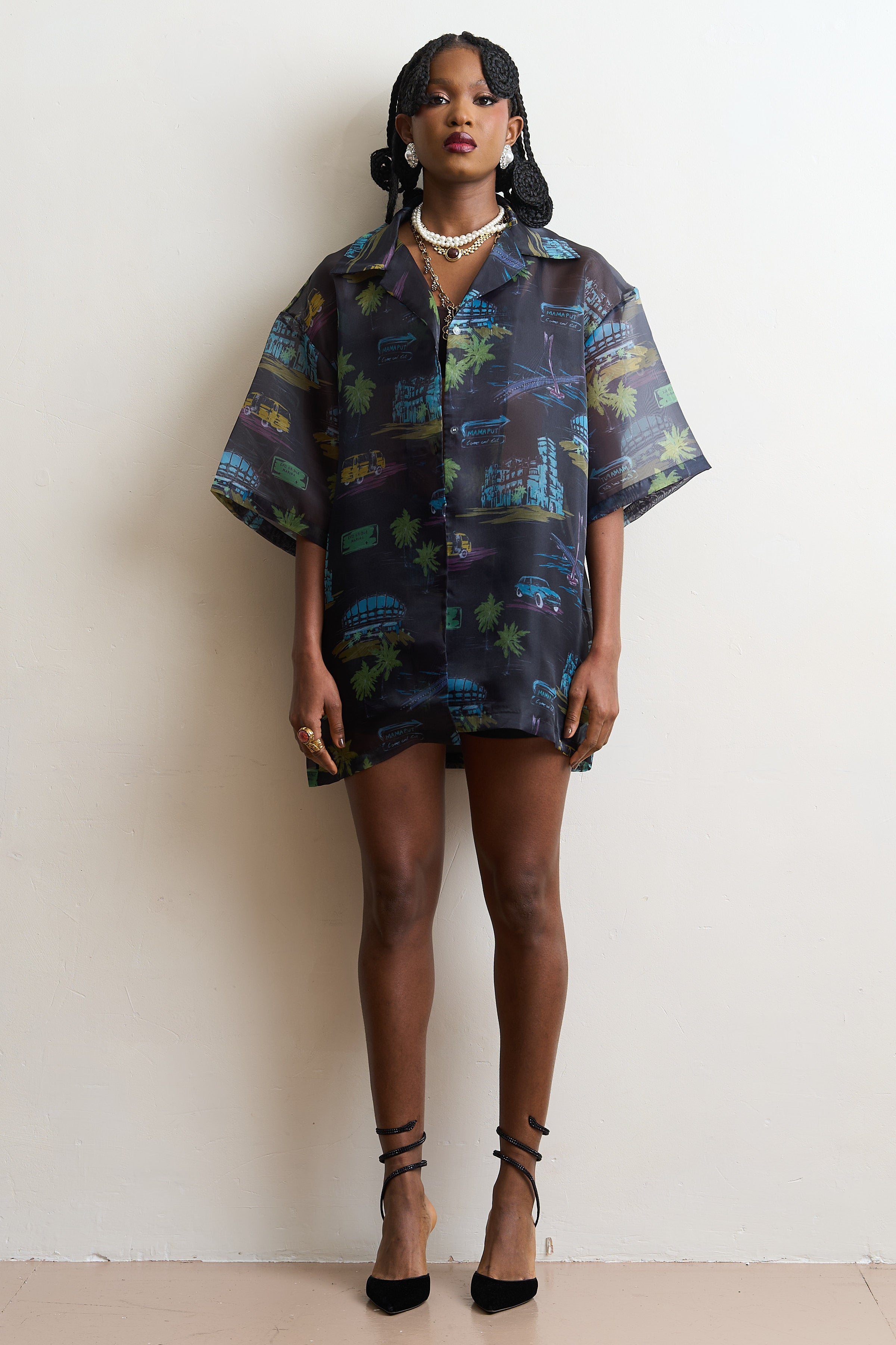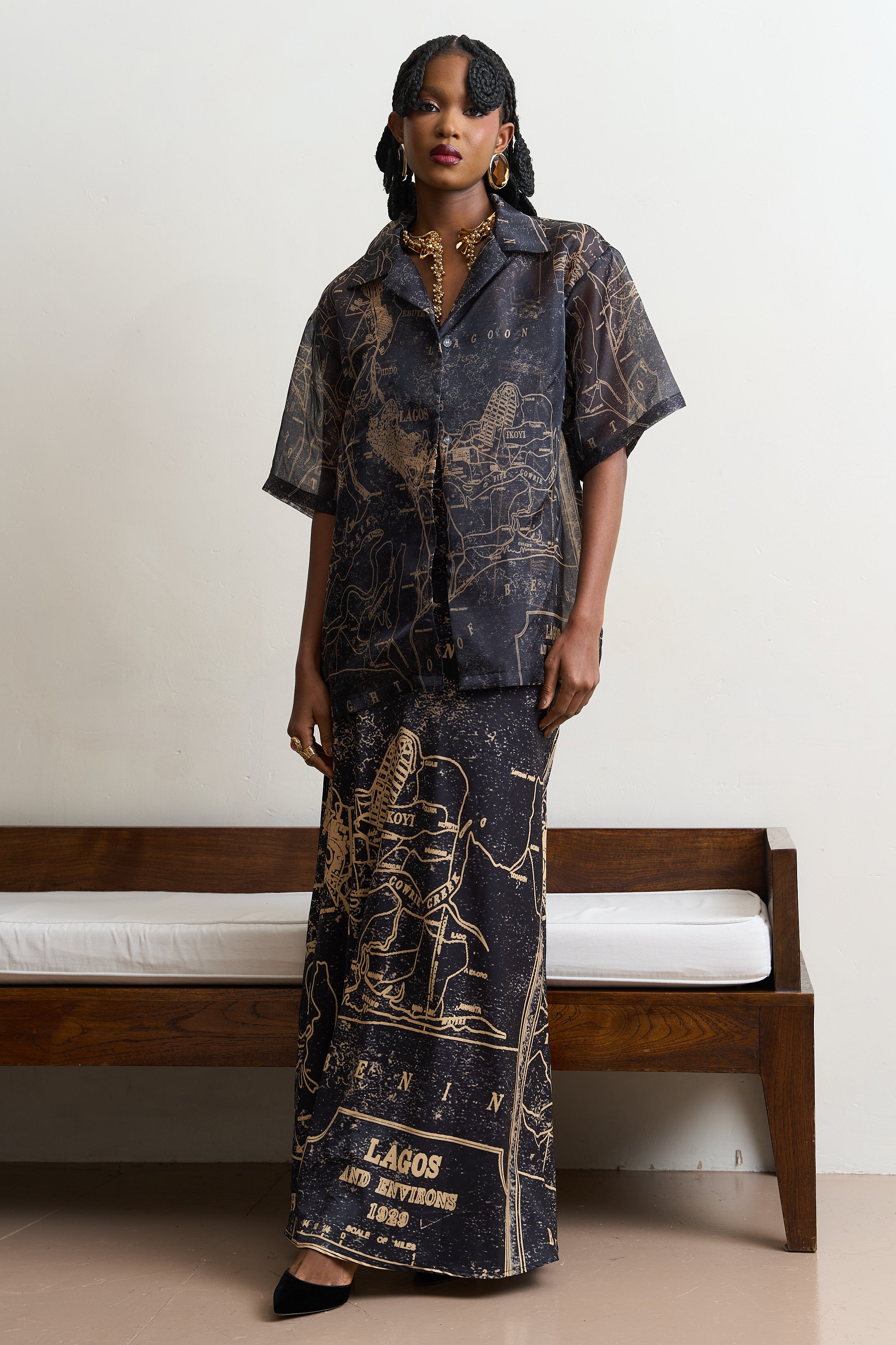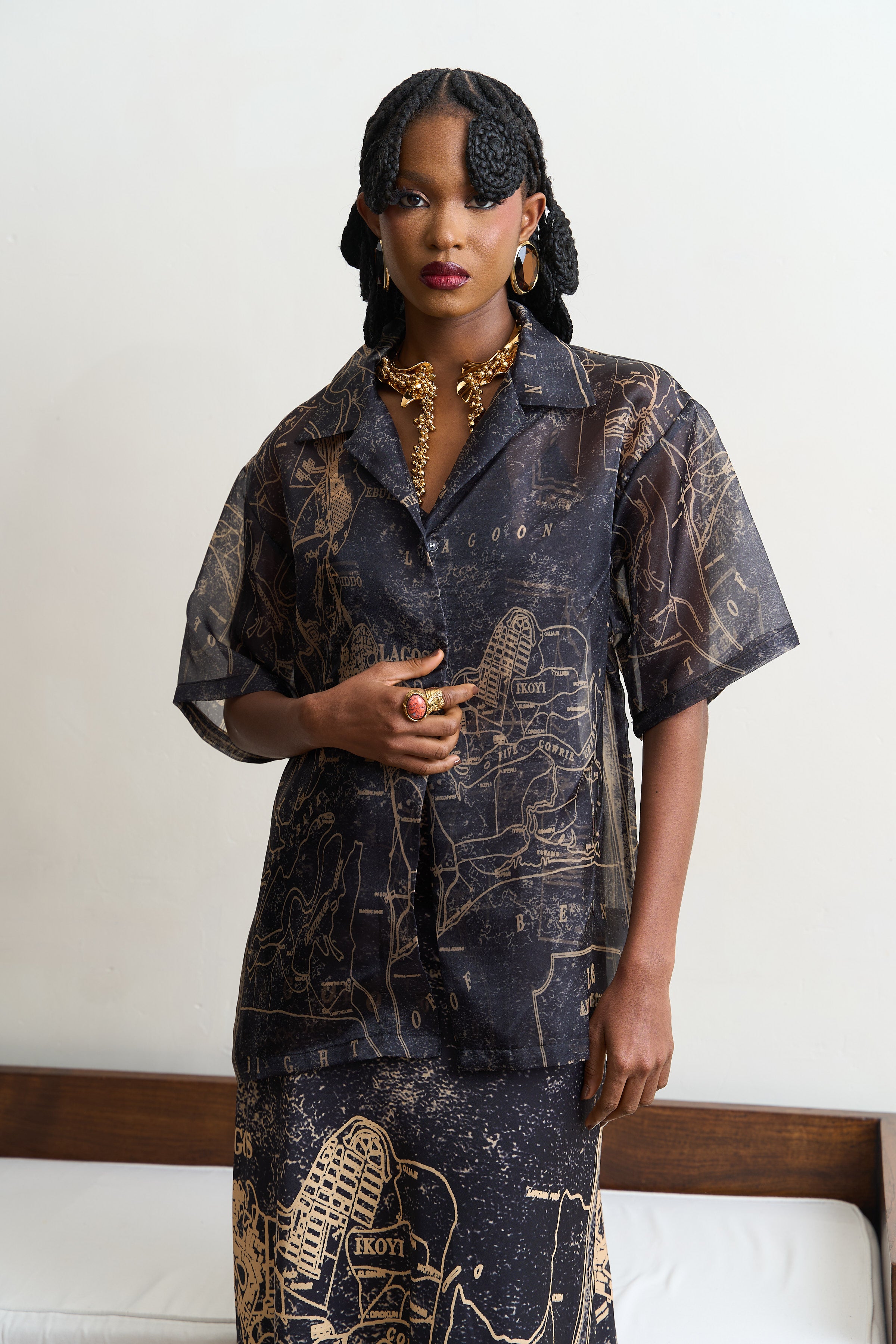 OLD LAGOS MAP PRINT ORGANZA SHIRT BROWN