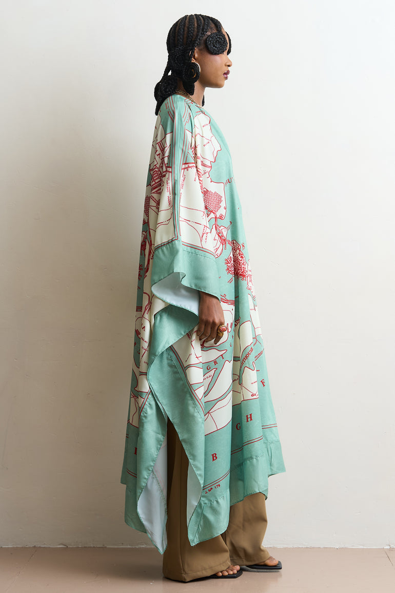 A map of the roads we once walked. A long oversized kaftan in a fresh mint hue, featuring the “Old Lagos Map” archival print. Styled here over trousers or wear classic bubu-style.