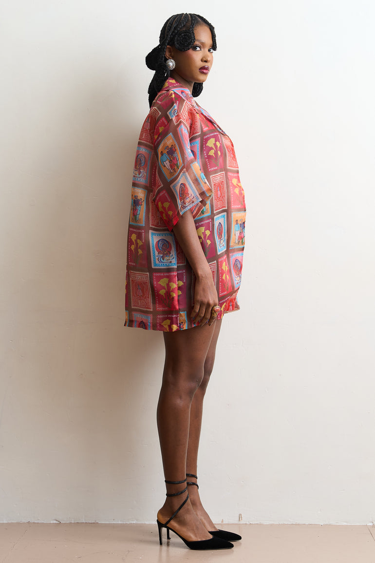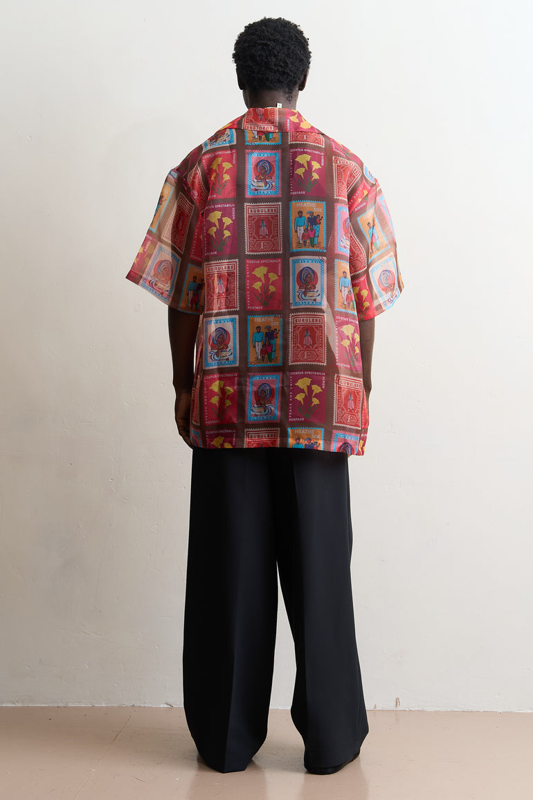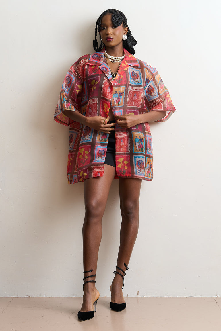 Our sheer organzas are the perfect styling pieces all year round. The oversized fit makes them ideal as a breezy cover-up in warmer climates or as a layering piece during the colder months. This style features the iconic "Post Stamp" print.