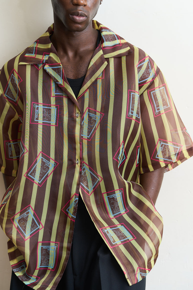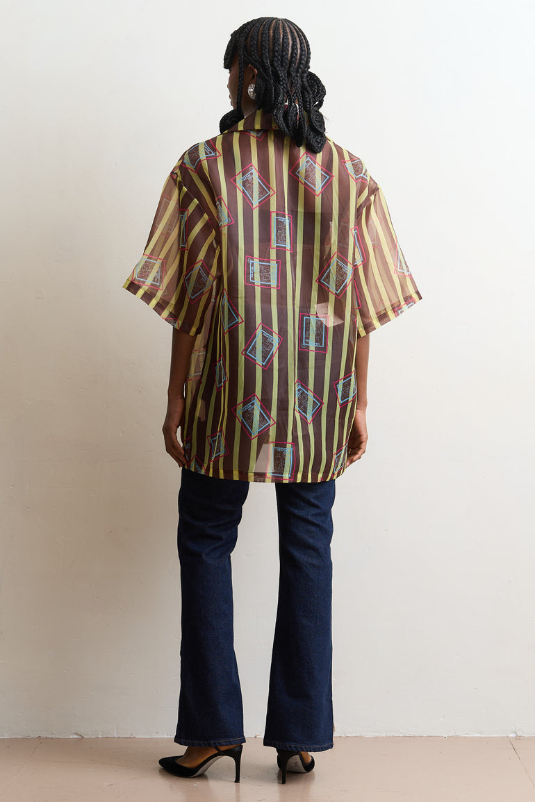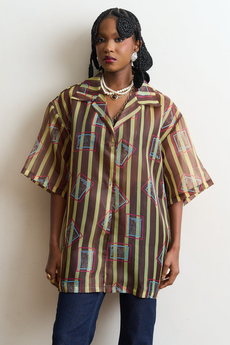 Our sheer organzas are the perfect styling pieces all year round. The oversized fit makes them ideal as a breezy cover-up in warmer climates or as a layering piece during the colder months. This style features bold striped behind the iconic "Post Stamp" motif.