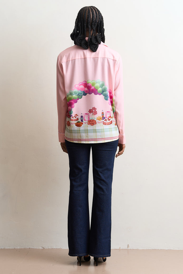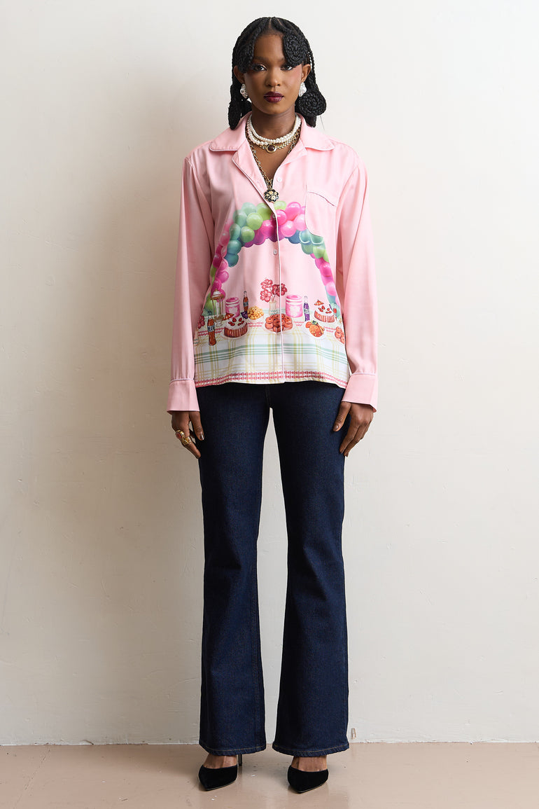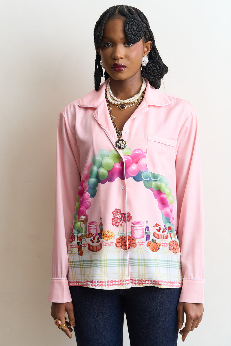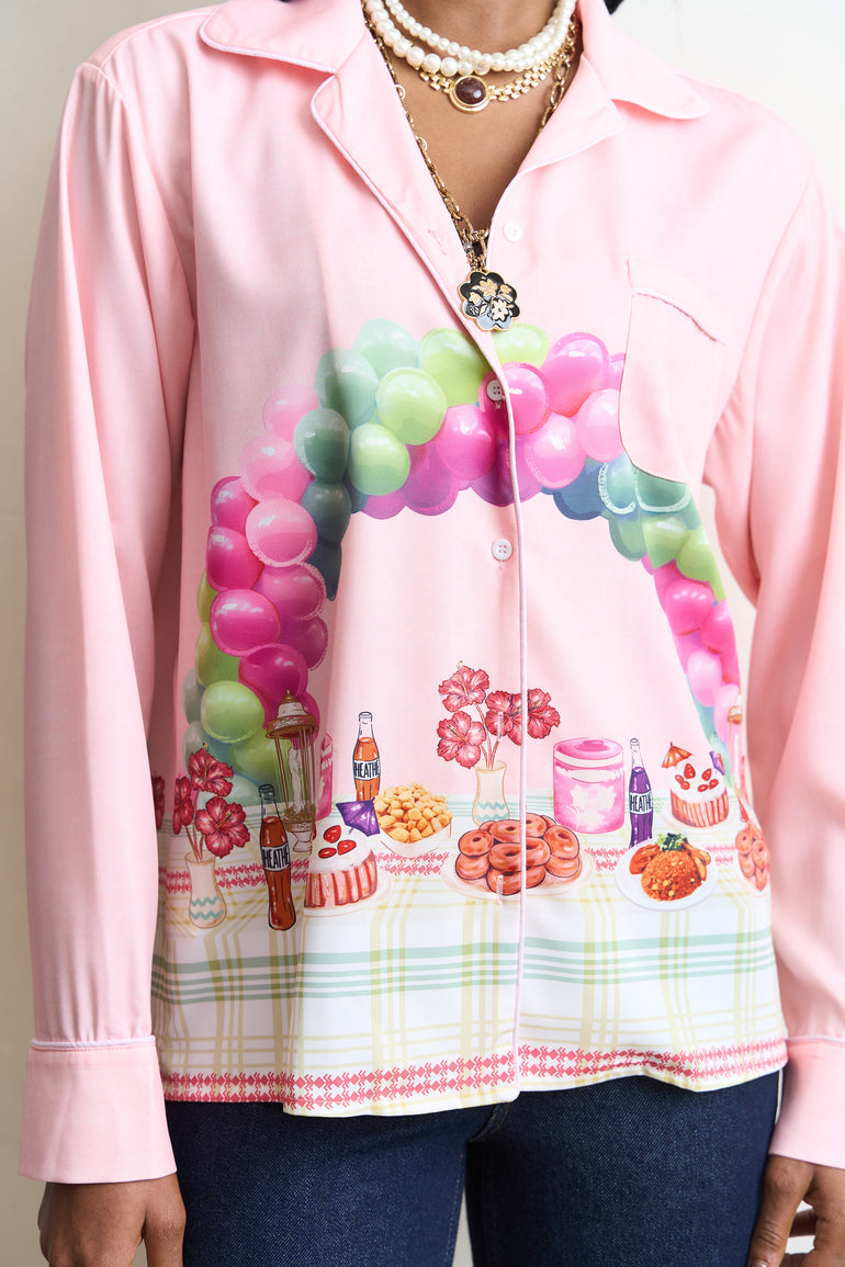 Pyjama-style shirt with the "Aunty Give me Cake" print set on a pink backdrop.
