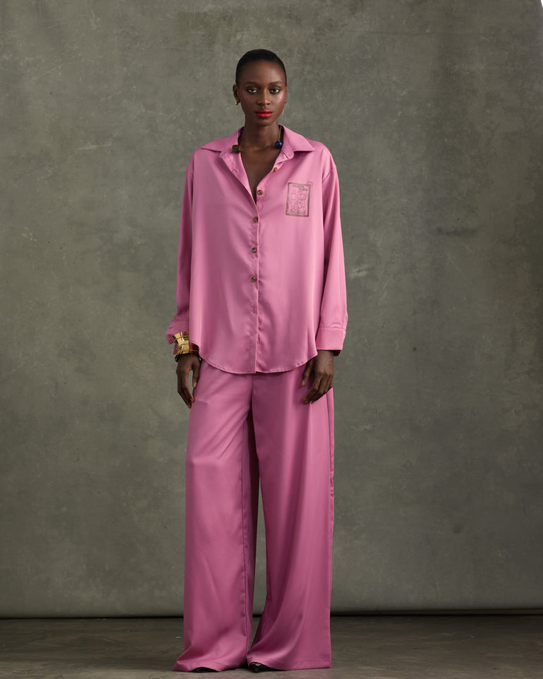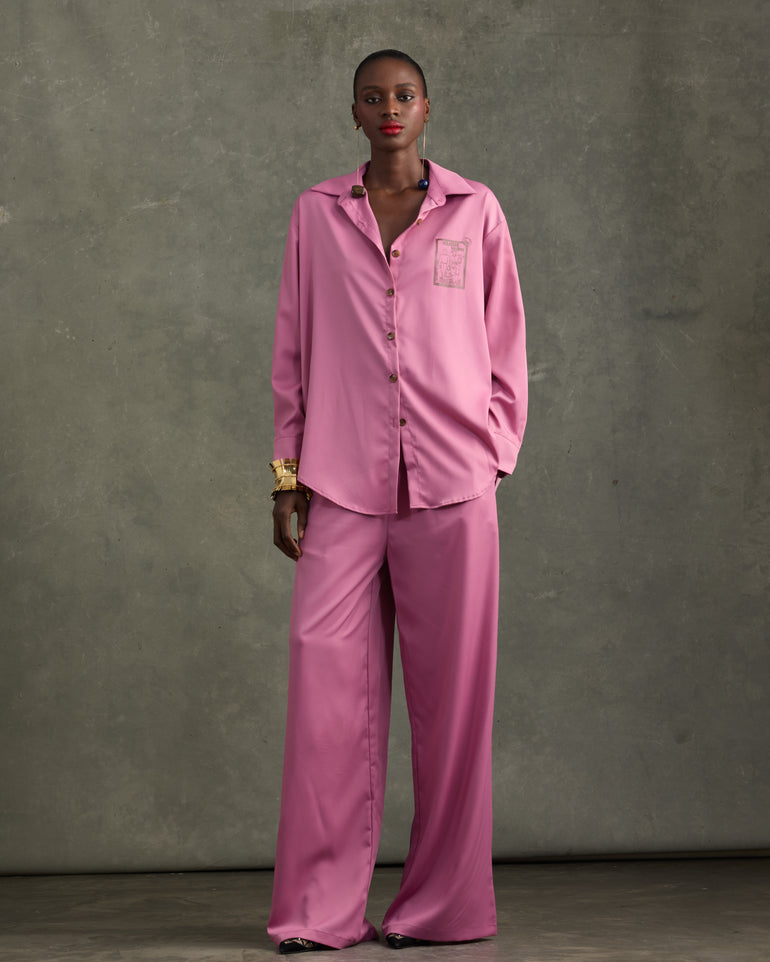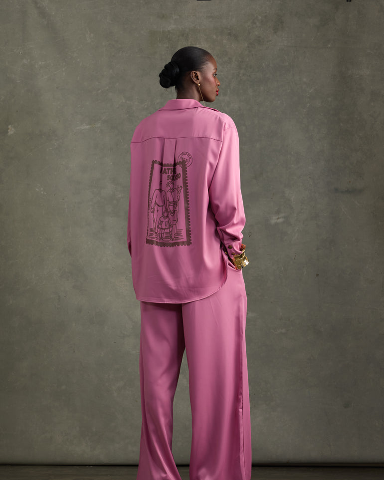 Pyjama set the Heathe way - not just for the house. Elevate your everyday with an iconic look. A loose-fit shirt stamped with the HEATHE Post Stamp on the front and back of the shirt - paired with matching loose-fit trousers.