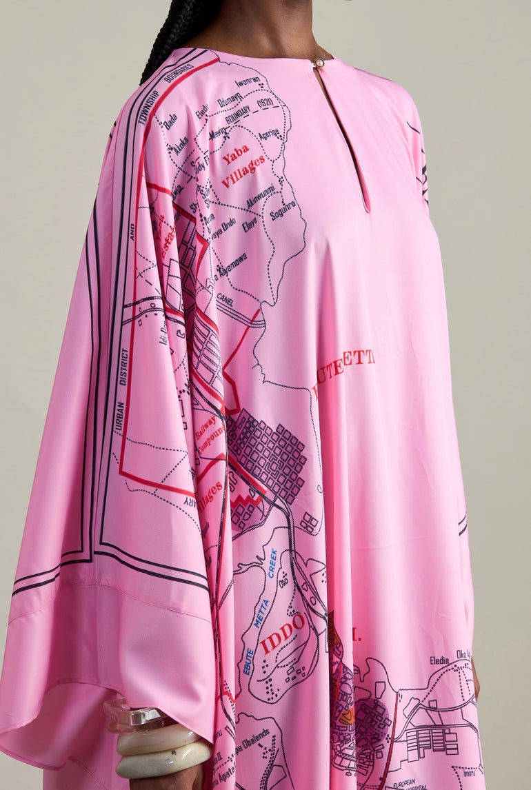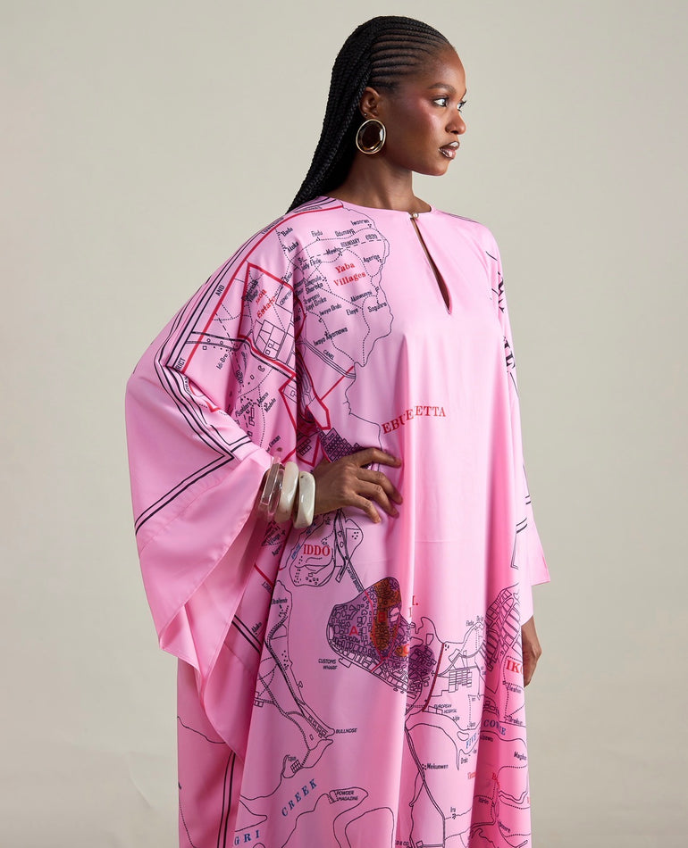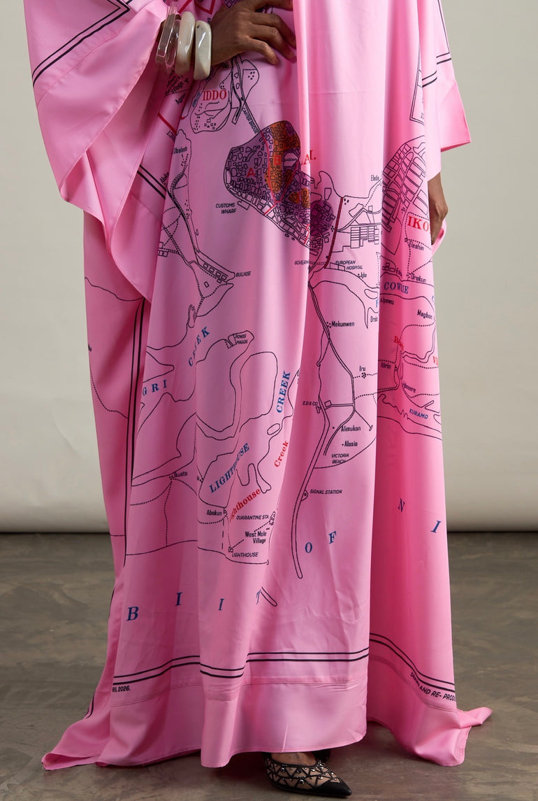 A pink maxi kaftan with red and brown accents, featuring the “1931 Census” print.