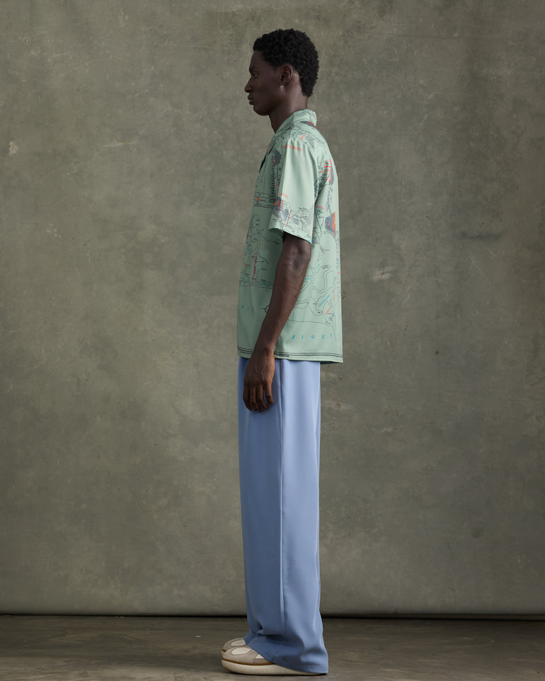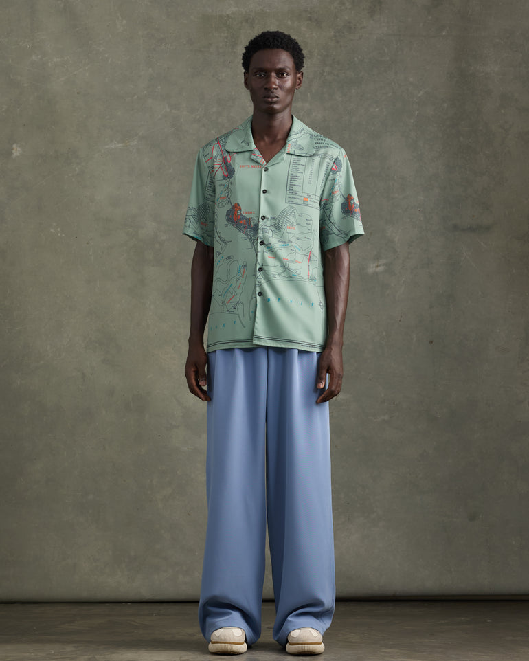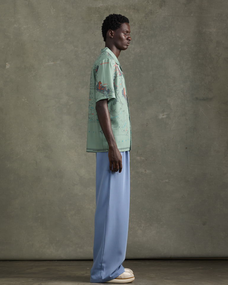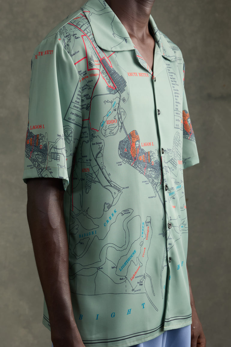 Short-sleeve olive satin shirt featuring the “1931 Census Map” print - a trip down memory lane. A casual loose-fit button satin shirt that elevates your everyday. Style casually with jeans or a smarter approach with the HEATHE Alto Trousers.