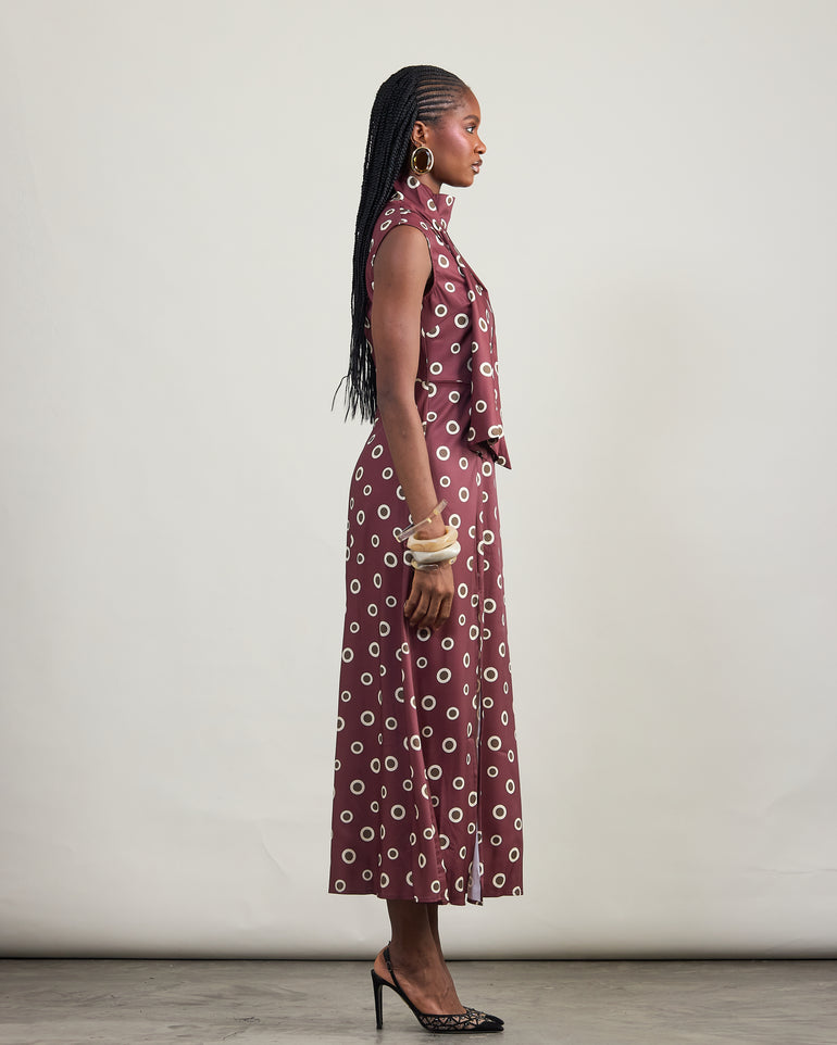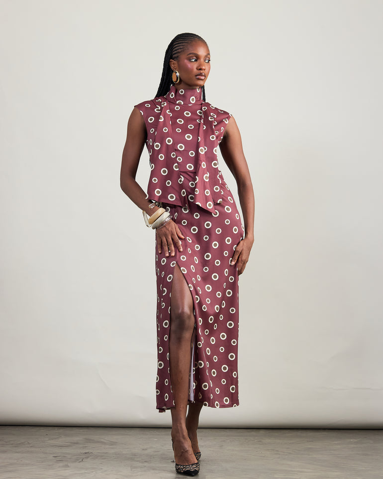 A maroon polka-dot midi dress, cut with a high neckline and an attached tie scarf. Designed in a fitted silhouette with a thigh-high slit, it transitions effortlessly from day to night. Style with pumps, heeled boots or pointed heels.