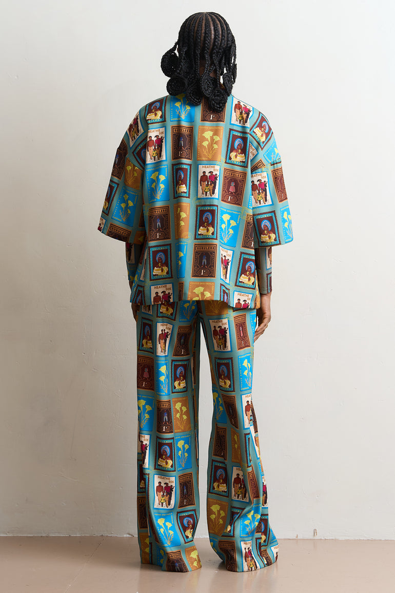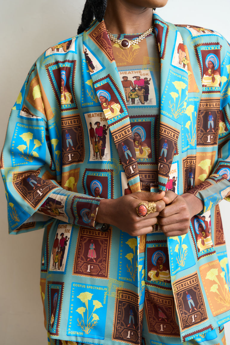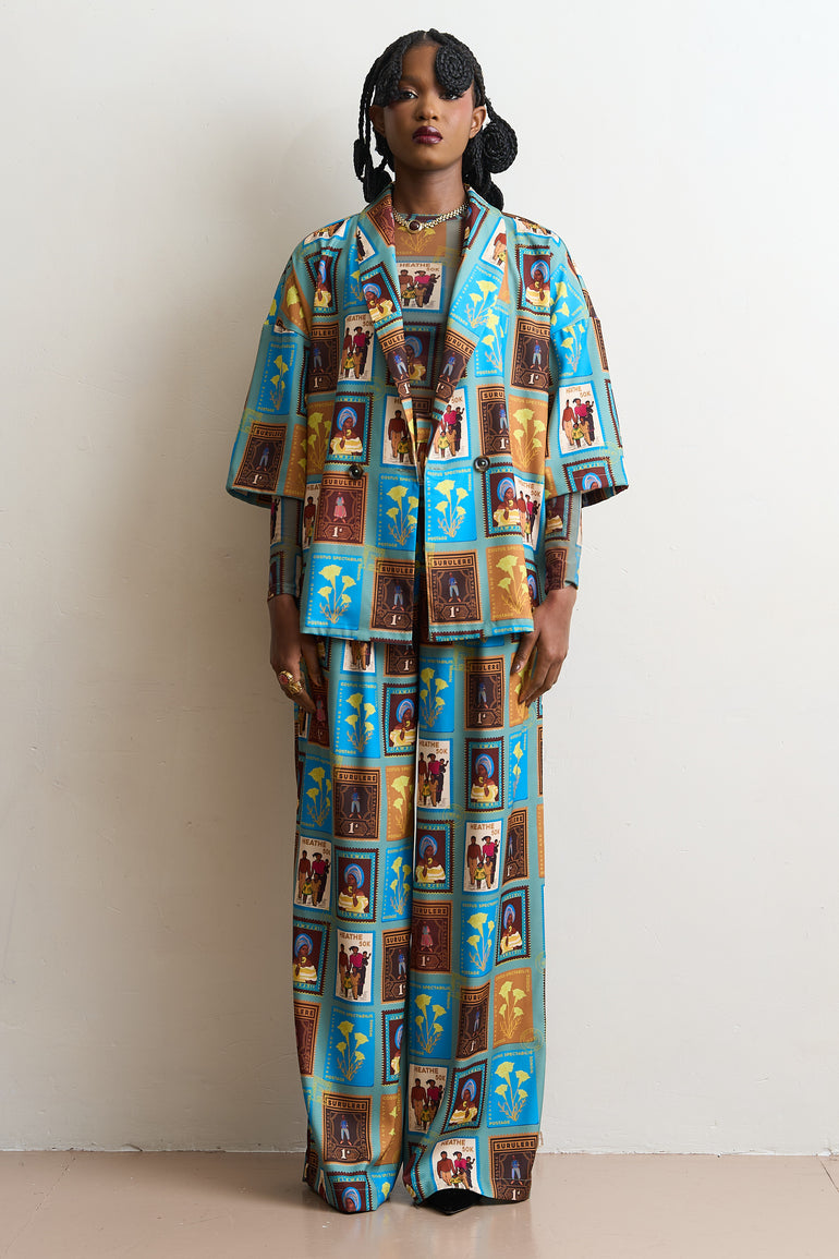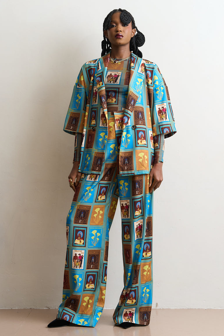 The "Post Stamp" print set behind a blue backdrop. Featuring a wrap-front silhouette blazer jacket, it blends cultural storytelling with contemporary design. Trousers cut in a relaxed silhouette they offer comfort with style. Featuring our signature side-adjusters for a custom fit.