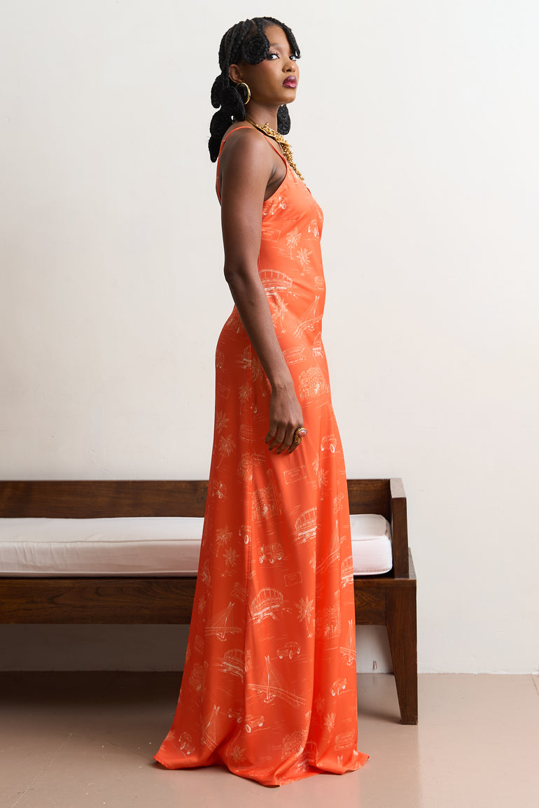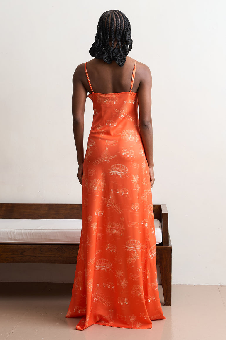 Effortless, chic elegance, that’s the Heathe Slip Dress. The satin slip dress features the iconic "Eko" print in bright orange. A flowy fit for your elevated everyday and a satin touch for dressed up evenings. Create a maximalist look with the matching organza shirt and scarf.