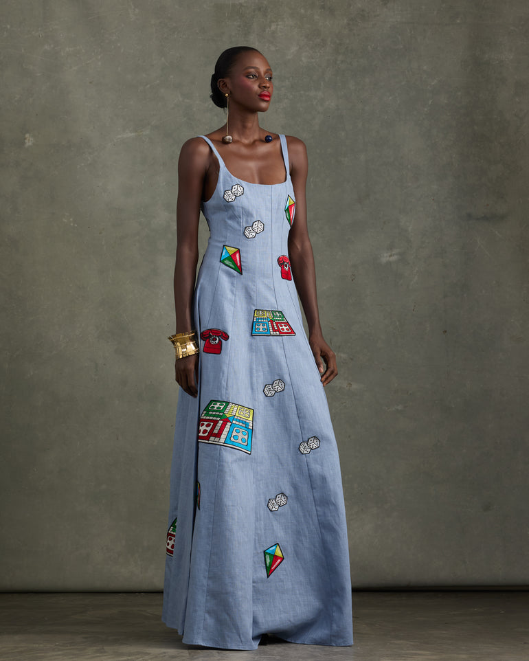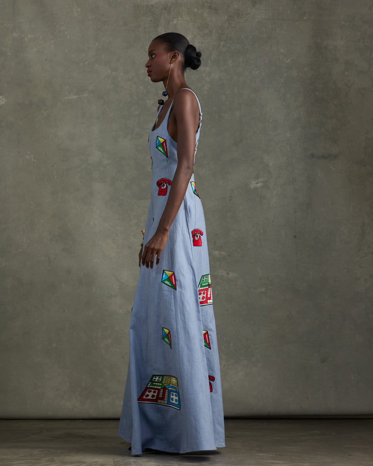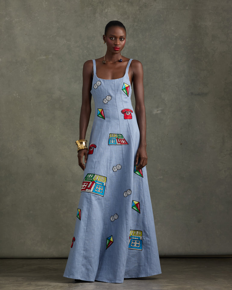 Soft linen, but bold style. A panelled linen maxi dress featuring a scoop neckline and elongated A-line shape. Embroidered with motifs from the "Games we Played" print. Make the dress the statement or the key base for your everyday wardrobe staples.