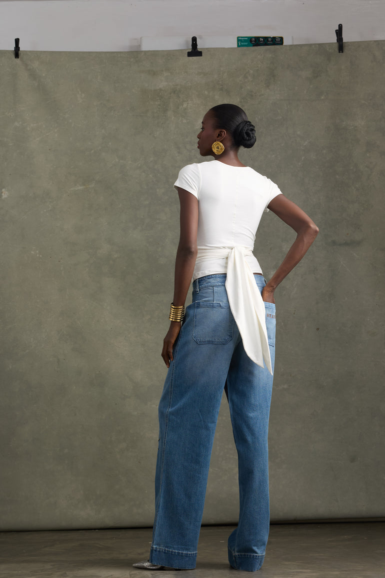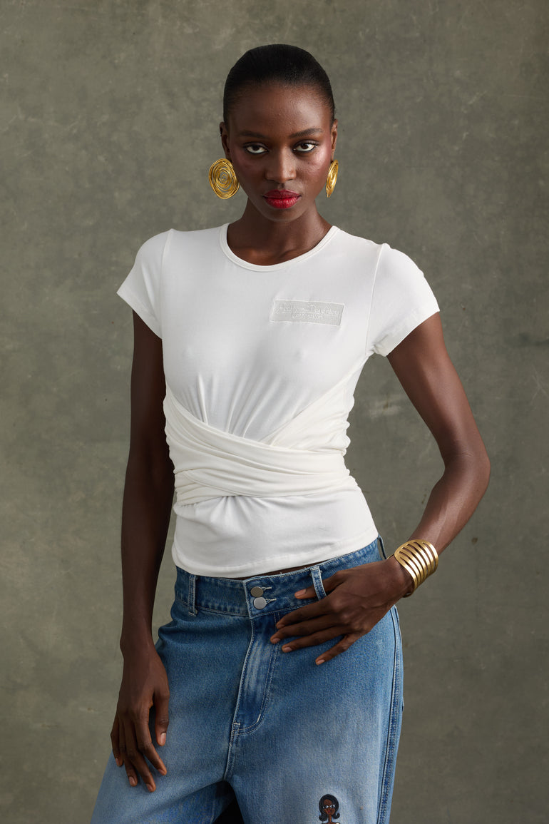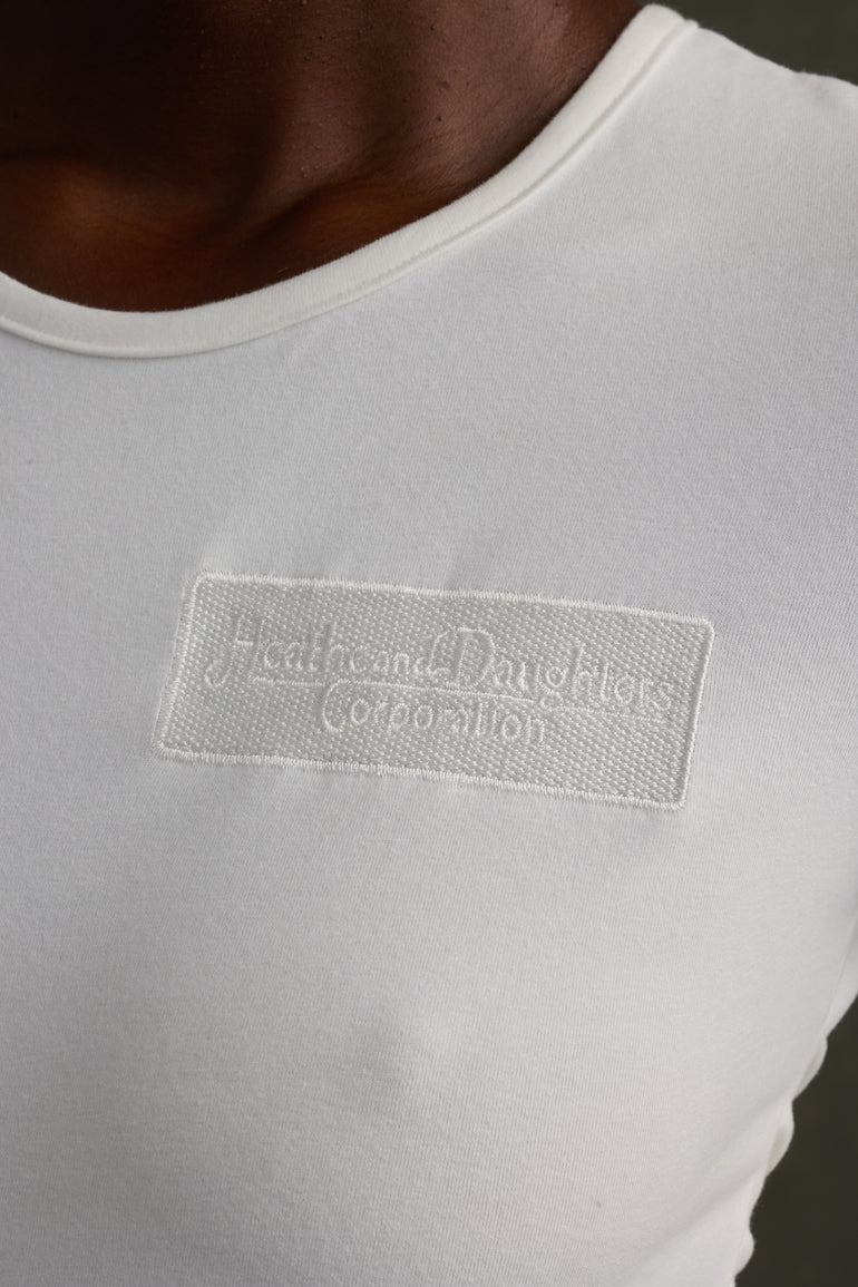 Fitted T-shirt with the "Heathe and Daughters" embroidered badge. Simple, but with a nostalgic nod. It features draped waist detail, elevating your average white T-shirt. An everyday staple for your everyday, but elevated.