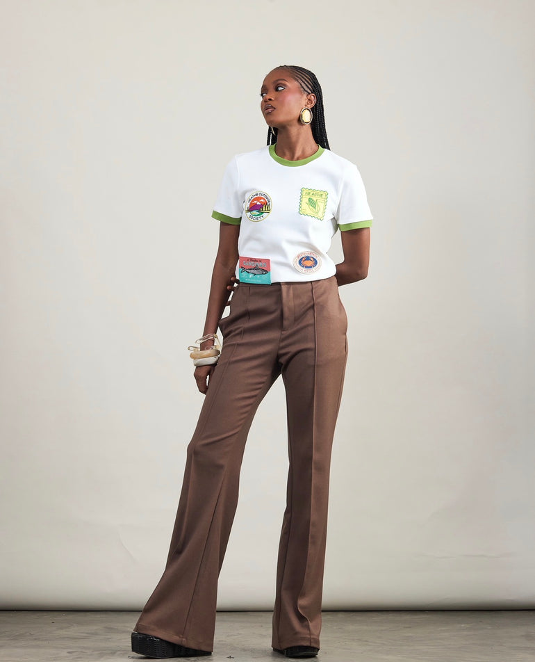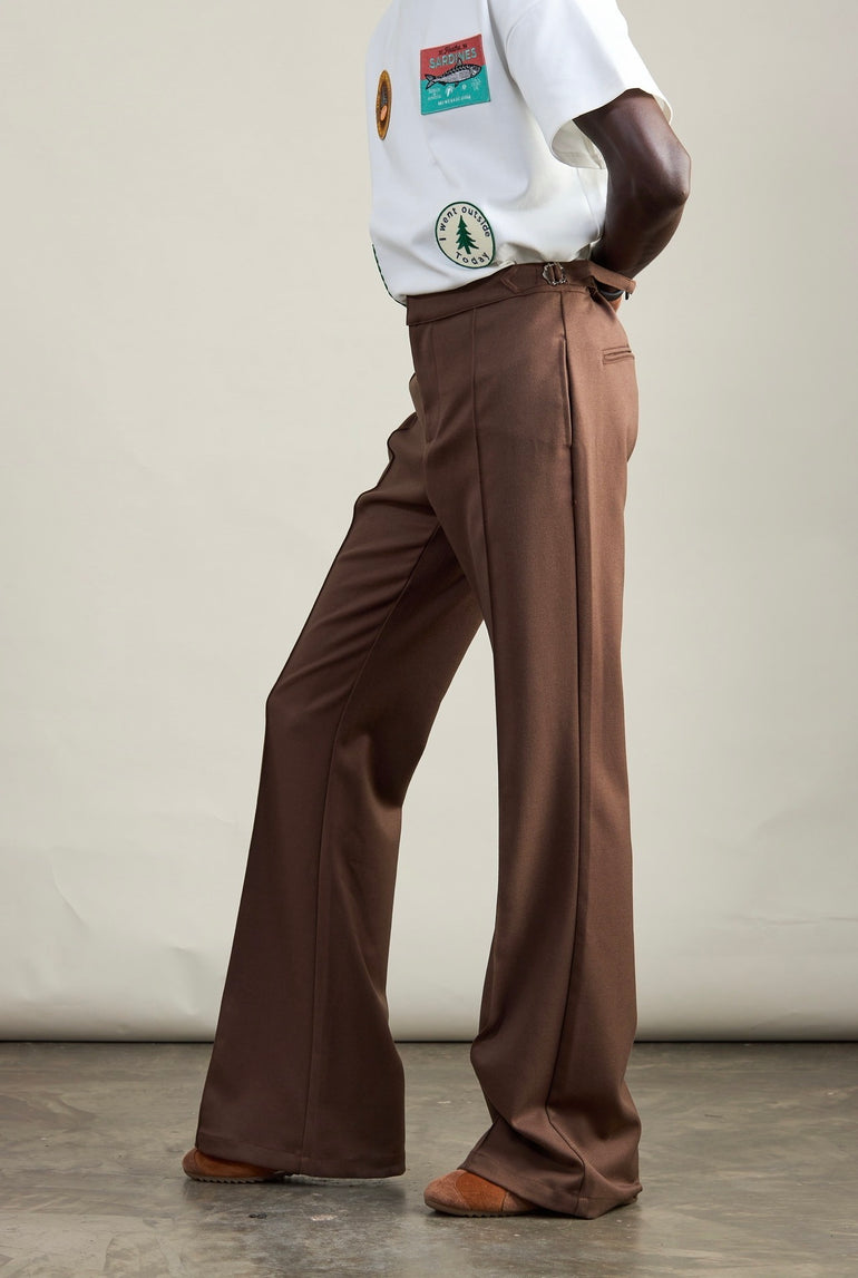 Brown slim-fit flared trousers with front and back seams. Perfect for adding an unconventional touch to smart dressing or elevating your everyday staples. Available in brown.