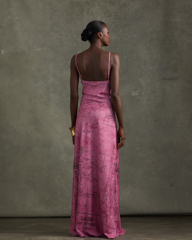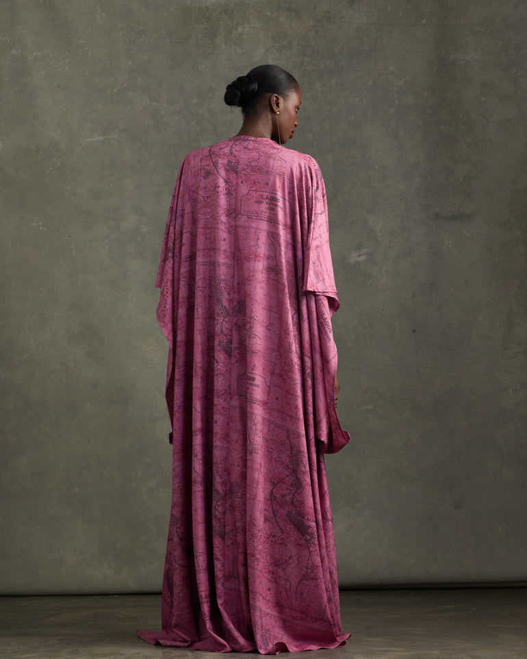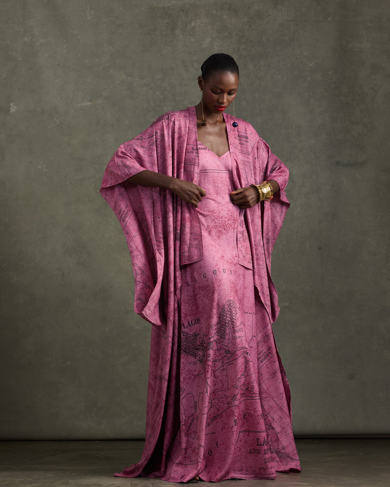 High-low draped kaftan and slick slip maxi dress, depicting the "Old Lagos Map" print in a muted pink. Wear them individually to elevate your everyday wardrobe staples or styled together for the ultimate HEATHE look.