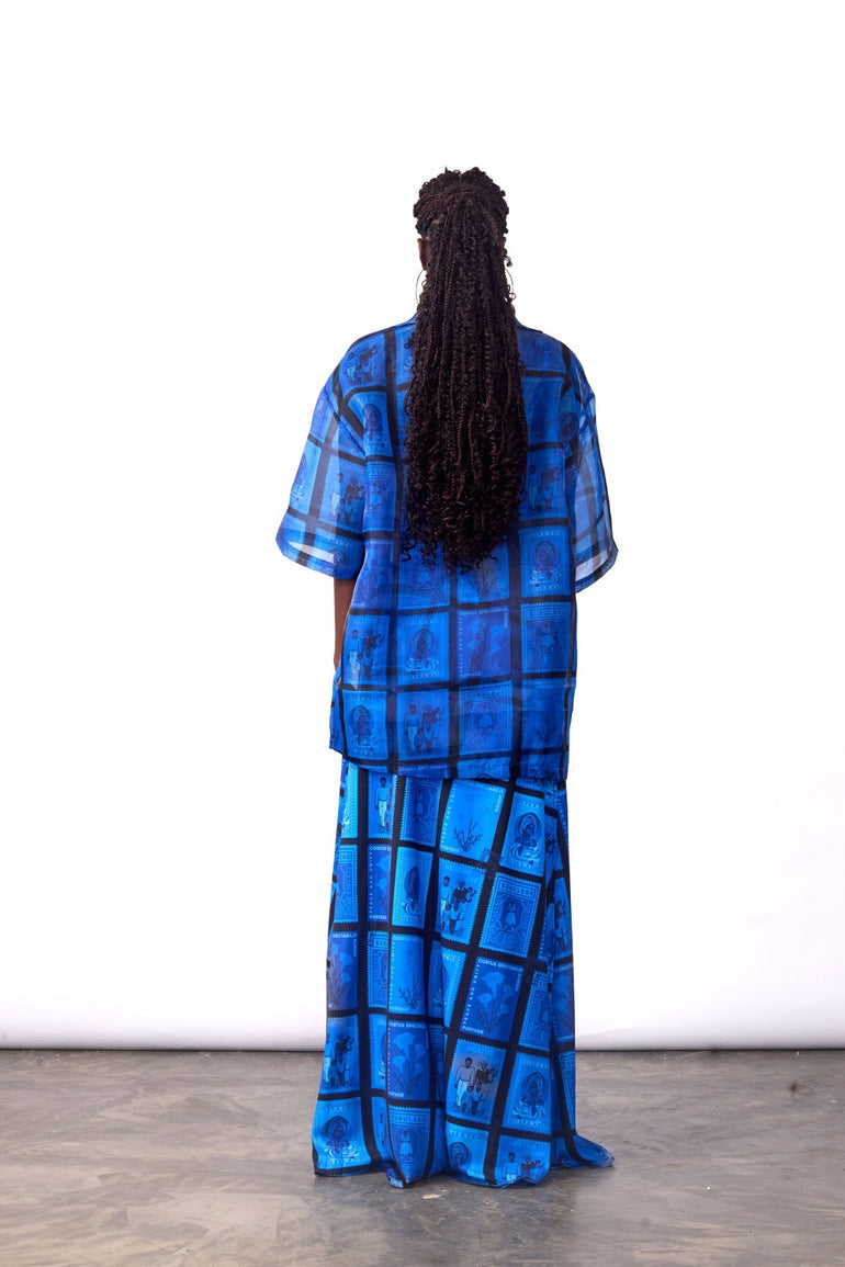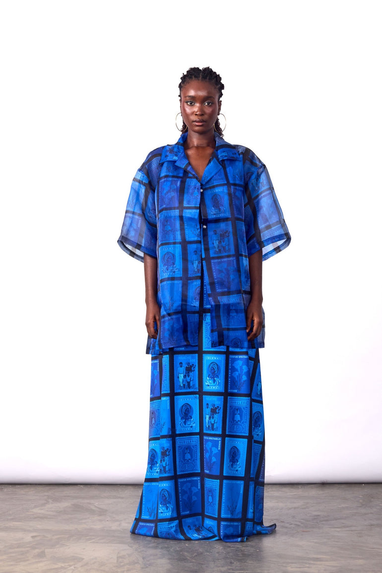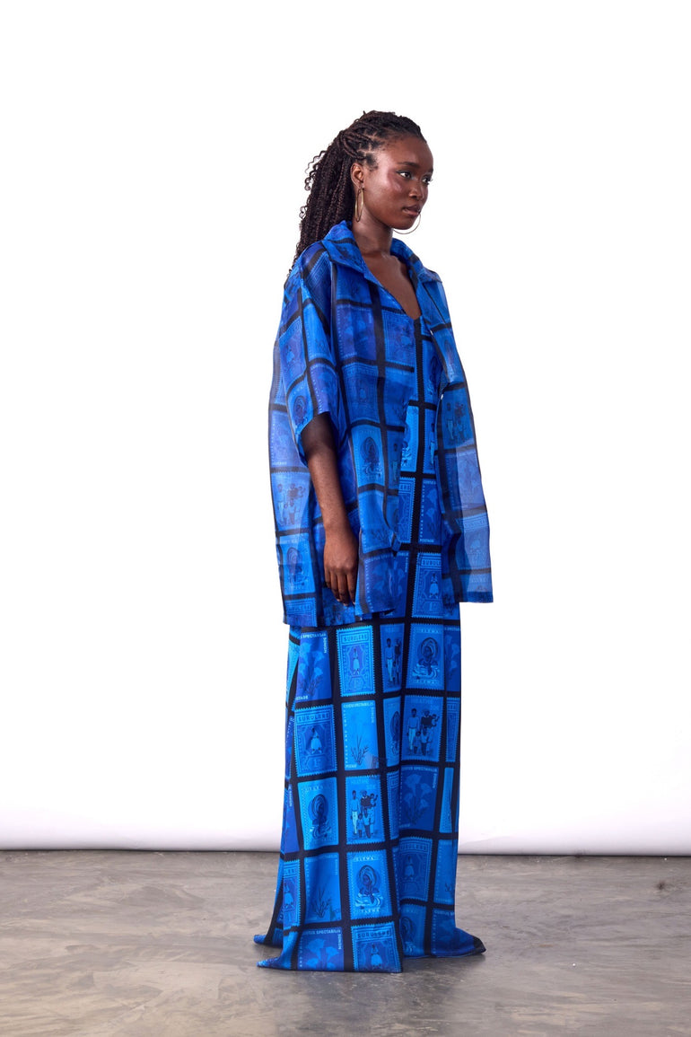 Our sheer organzas are the perfect styling pieces all year round. The oversized fit makes it the perfect summer cover-up or to layer winter looks during the colder months. The Post Stamp Organza features the original Post Stamp print in blue, pair it with the matching slip dress and scarf to complete the look.