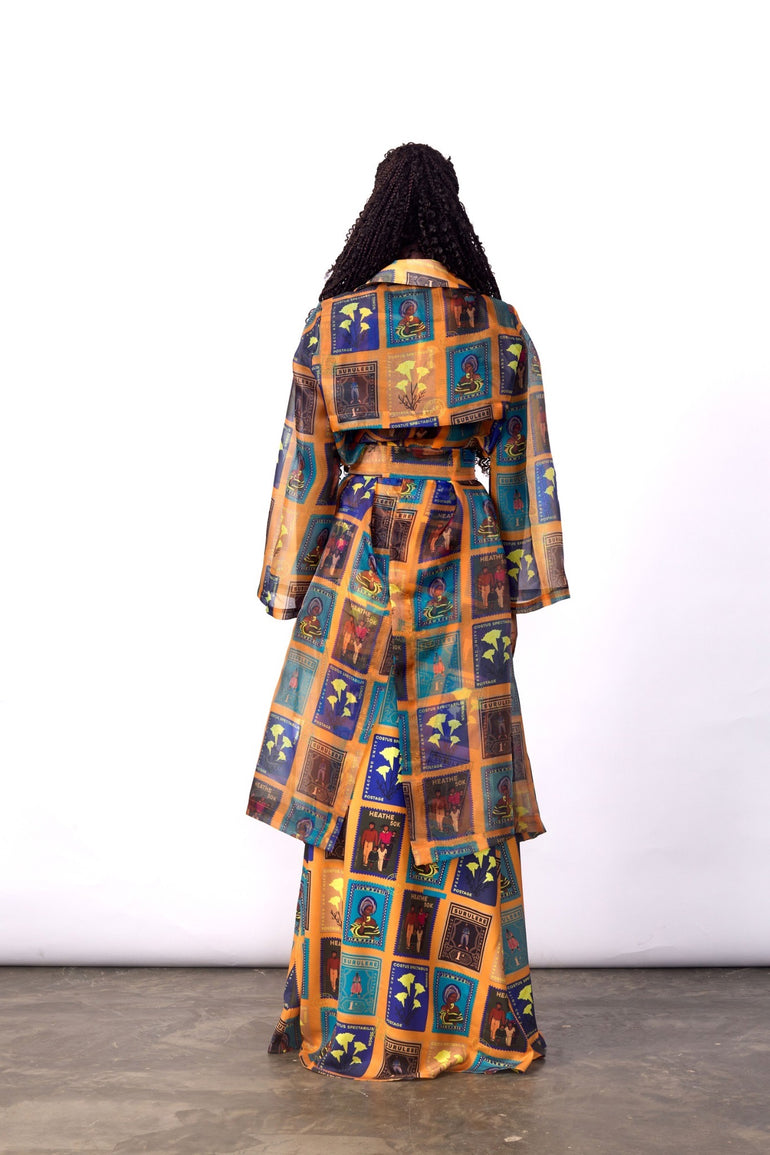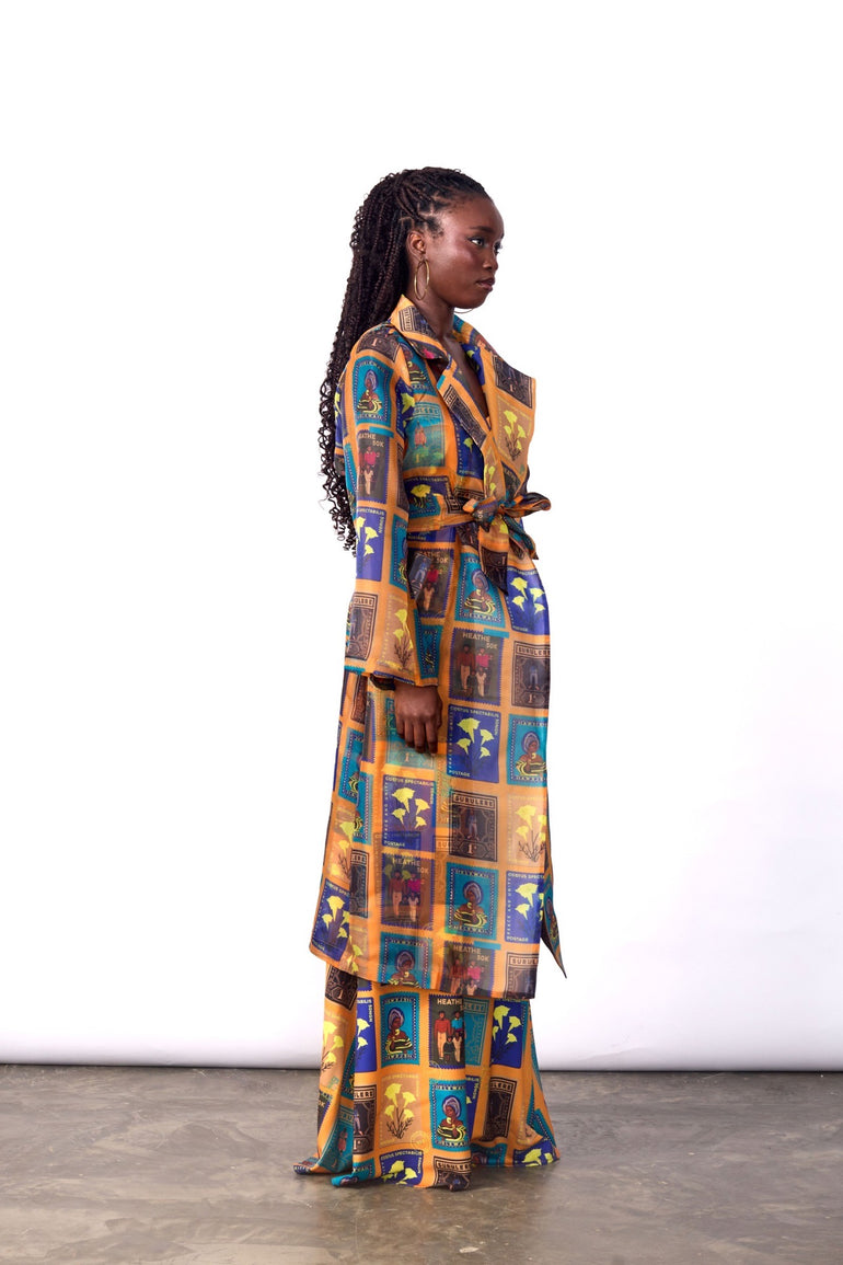 The Post Stamp Print Organza Jacket gives the classic trench coat a fun and unconventional twist, light in feel but bold in colour. The print reimagines the original Post Stamp print with yellow and blue shades. Drape the organza jacket over the matching slip dress to complete the look or any trousers from the HEATHE collection.