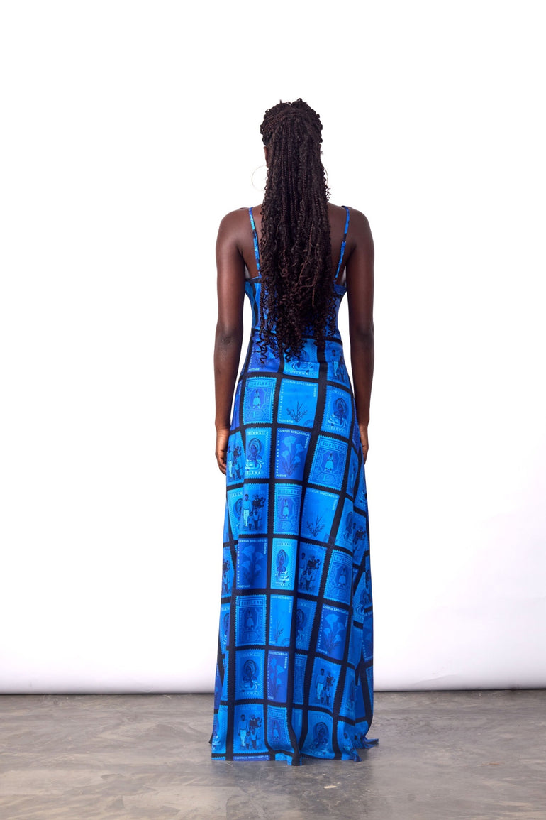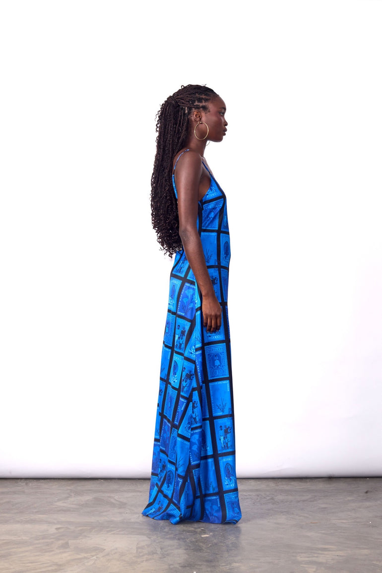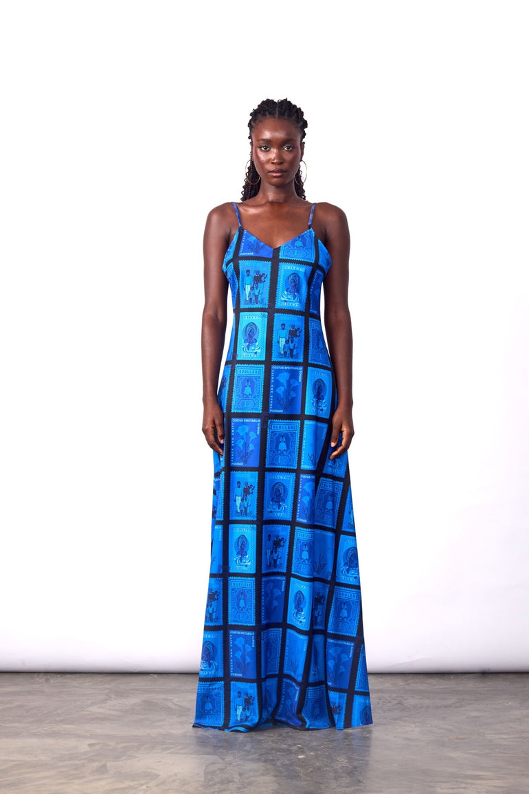 POST STAMP PRINT SLIP DRESS BLUE