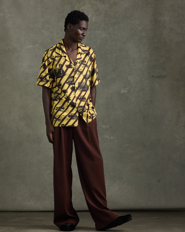 Yellow short-sleeve satin shirt featuring the popular Eko Icons print layered with brown stripes. A casual loose-fit button satin shirt that elevates your everyday. Style casually with jeans or a smarter approach with the HEATHE Alto Trousers.